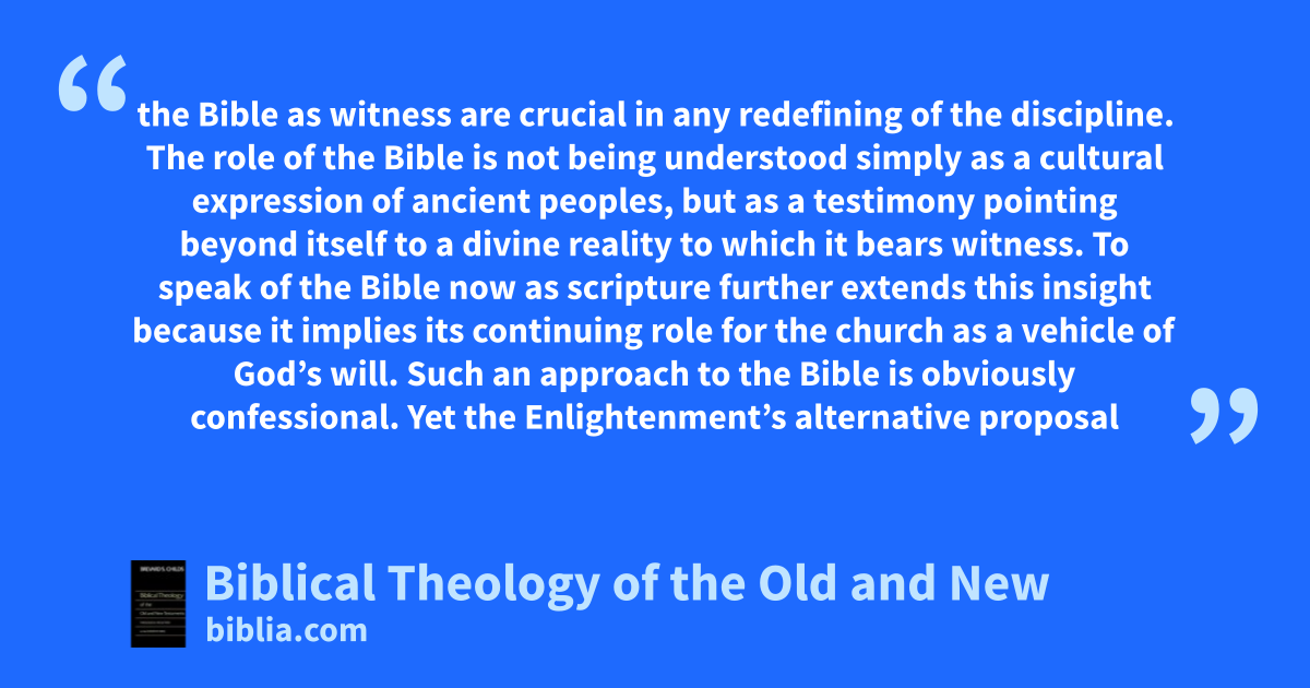 the Bible as witness are crucial in any redefining of the discipline. The role of the Bible is not being understood simply as a cultural expression of ancient peoples, but as a testimony pointing beyond itself to a divine reality to which it bears witness. To speak of the Bible now as scripture further extends this insight because it implies its continuing role for the church as a vehicle of God’s will. Such an approach to the Bible is obviously confessional. Yet the Enlightenment’s alternative proposal