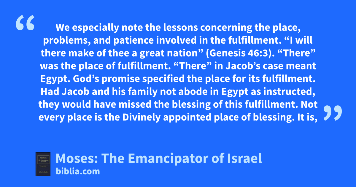 We especially note the lessons concerning the place, problems, and patience involved in the fulfillment. “I will there make of thee a great nation” (Genesis 46:3). “There” was the place of fulfillment. “There” in Jacob’s case meant Egypt. God’s promise specified the place for its fulfillment. Had Jacob and his family not abode in Egypt as instructed, they would have missed the blessing of this fulfillment. Not every place is the Divinely appointed place of blessing. It is,
