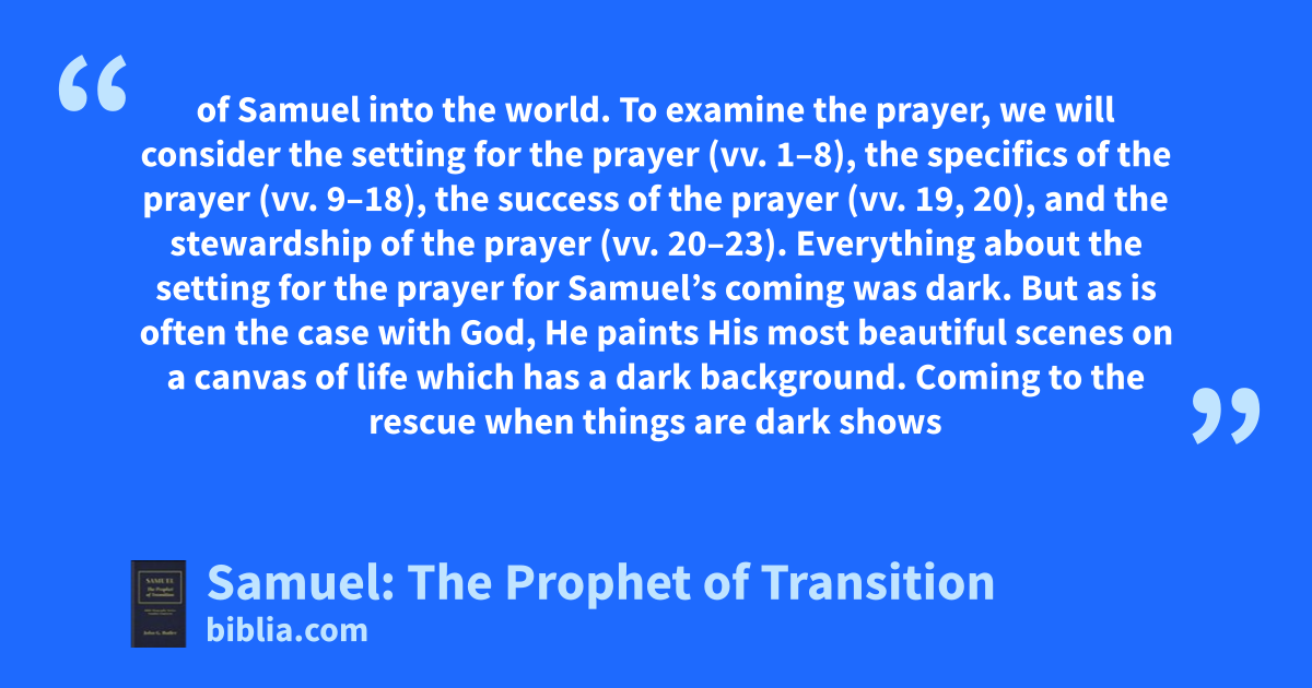 of Samuel into the world. To examine the prayer, we will consider the setting for the prayer (vv. 1–8), the specifics of the prayer (vv. 9–18), the success of the prayer (vv. 19, 20), and the stewardship of the prayer (vv. 20–23). Everything about the setting for the prayer for Samuel’s coming was dark. But as is often the case with God, He paints His most beautiful scenes on a canvas of life which has a dark background. Coming to the rescue when things are dark shows