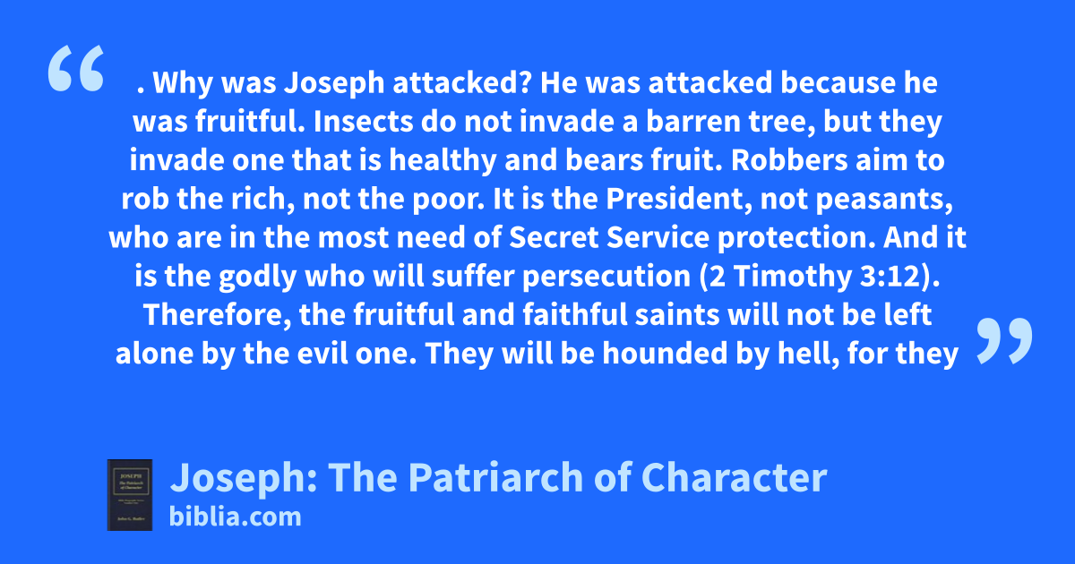 . Why was Joseph attacked? He was attacked because he was fruitful. Insects do not invade a barren tree, but they invade one that is healthy and bears fruit. Robbers aim to rob the rich, not the poor. It is the President, not peasants, who are in the most need of Secret Service protection. And it is the godly who will suffer persecution (2 Timothy 3:12). Therefore, the fruitful and faithful saints will not be left alone by the evil one. They will be hounded by hell, for they
