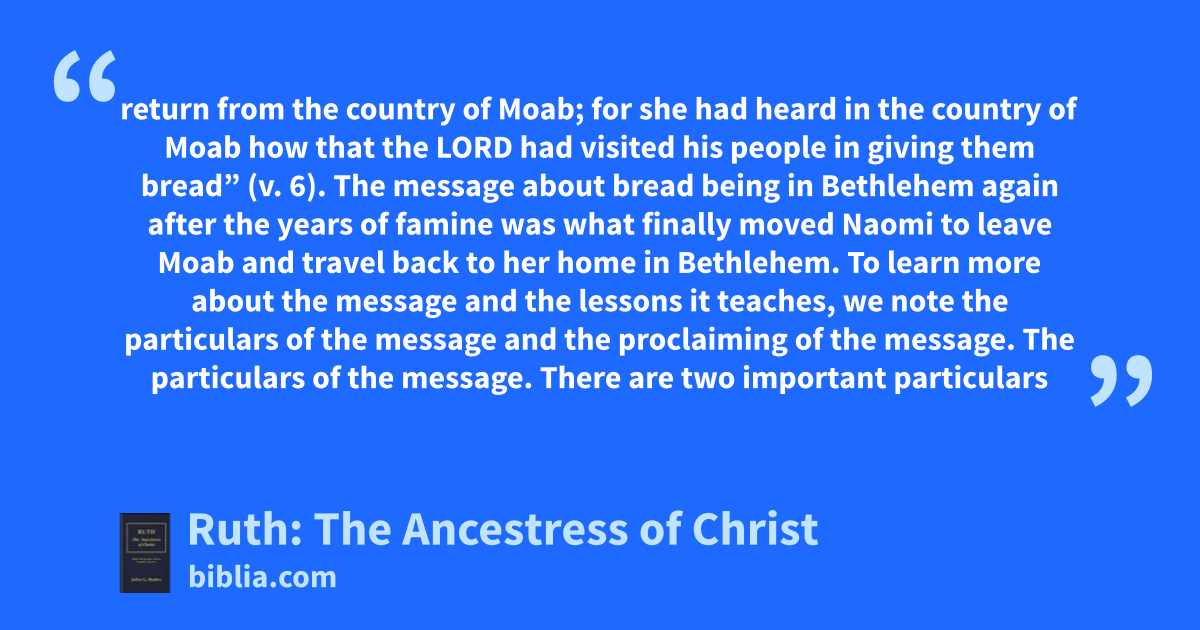 return from the country of Moab; for she had heard in the country of Moab how that the LORD had visited his people in giving them bread” (v. 6). The message about bread being in Bethlehem again after the years of famine was what finally moved Naomi to leave Moab and travel back to her home in Bethlehem. To learn more about the message and the lessons it teaches, we note the particulars of the message and the proclaiming of the message. The particulars of the message. There are two important particulars
