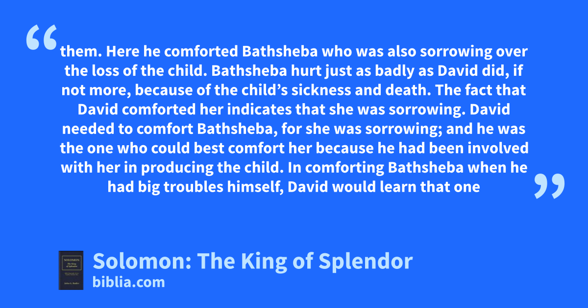 them. Here he comforted Bathsheba who was also sorrowing over the loss of the child. Bathsheba hurt just as badly as David did, if not more, because of the child’s sickness and death. The fact that David comforted her indicates that she was sorrowing. David needed to comfort Bathsheba, for she was sorrowing; and he was the one who could best comfort her because he had been involved with her in producing the child. In comforting Bathsheba when he had big troubles himself, David would learn that one