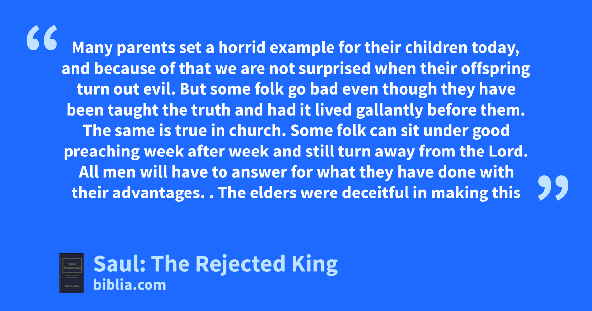 Many parents set a horrid example for their children today, and because of that we are not surprised when their offspring turn out evil. But some folk go bad even though they have been taught the truth and had it lived gallantly before them. The same is true in church. Some folk can sit under good preaching week after week and still turn away from the Lord. All men will have to answer for what they have done with their advantages. . The elders were deceitful in making this