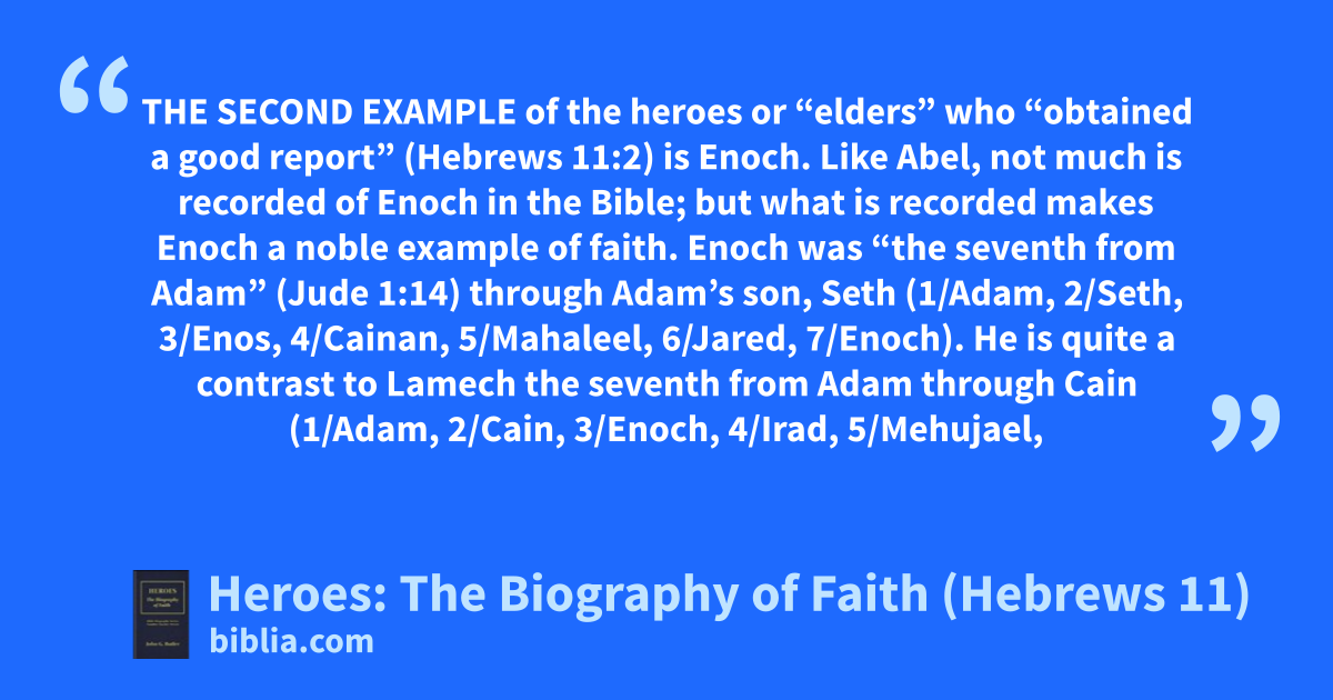 THE SECOND EXAMPLE of the heroes or “elders” who “obtained a good report” (Hebrews 11:2) is Enoch. Like Abel, not much is recorded of Enoch in the Bible; but what is recorded makes Enoch a noble example of faith. Enoch was “the seventh from Adam” (Jude 1:14) through Adam’s son, Seth (1/Adam, 2/Seth, 3/Enos, 4/Cainan, 5/Mahaleel, 6/Jared, 7/Enoch). He is quite a contrast to Lamech the seventh from Adam through Cain (1/Adam, 2/Cain, 3/Enoch, 4/Irad, 5/Mehujael,