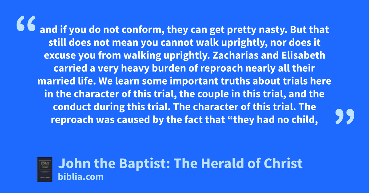 and if you do not conform, they can get pretty nasty. But that still does not mean you cannot walk uprightly, nor does it excuse you from walking uprightly. Zacharias and Elisabeth carried a very heavy burden of reproach nearly all their married life. We learn some important truths about trials here in the character of this trial, the couple in this trial, and the conduct during this trial. The character of this trial. The reproach was caused by the fact that “they had no child,