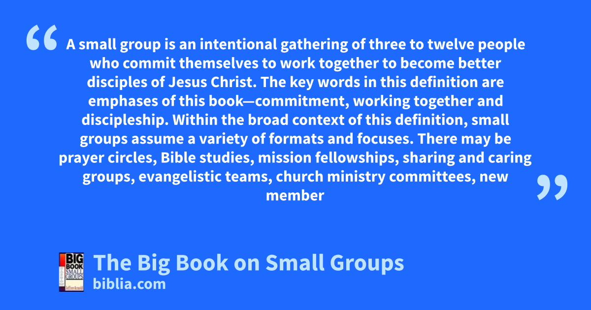 A small group is an intentional gathering of three to twelve people who commit themselves to work together to become better disciples of Jesus Christ. The key words in this definition are emphases of this book—commitment, working together and discipleship. Within the broad context of this definition, small groups assume a variety of formats and focuses. There may be prayer circles, Bible studies, mission fellowships, sharing and caring groups, evangelistic teams, church ministry committees, new member