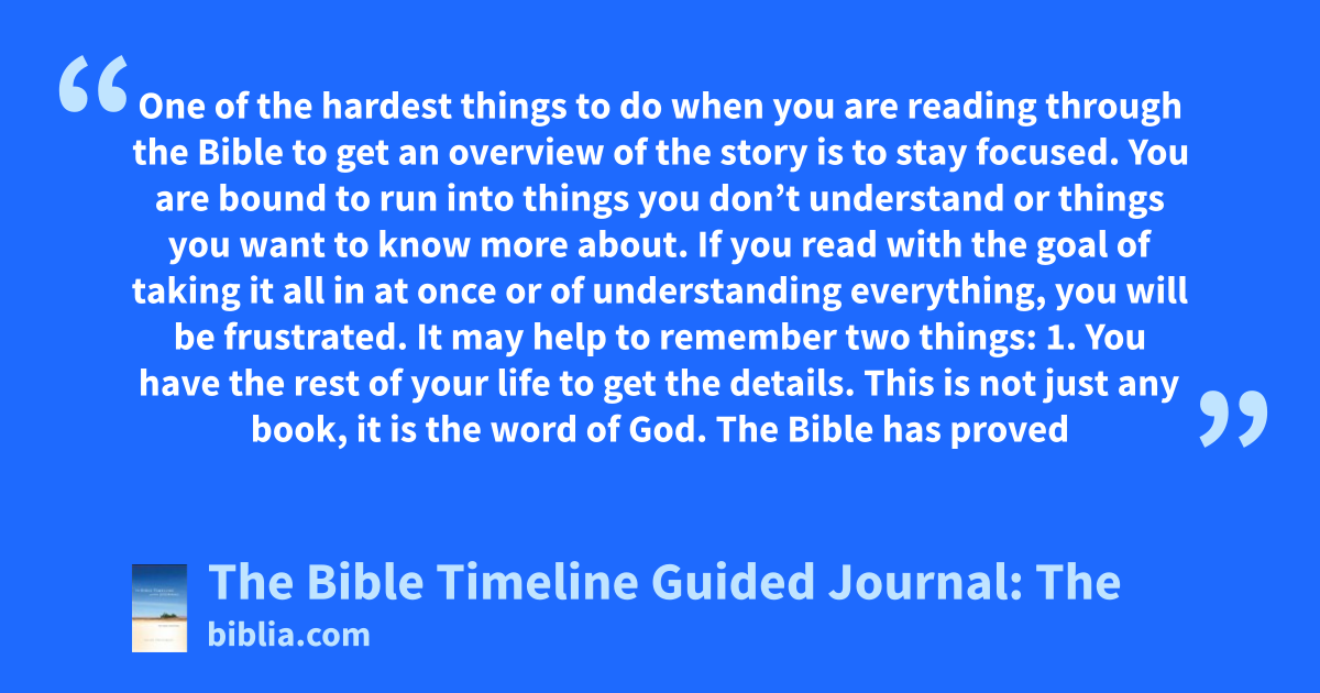One of the hardest things to do when you are reading through the Bible to get an overview of the story is to stay focused. You are bound to run into things you don’t understand or things you want to know more about. If you read with the goal of taking it all in at once or of understanding everything, you will be frustrated. It may help to remember two things: 1. You have the rest of your life to get the details. This is not just any book, it is the word of God. The Bible has proved