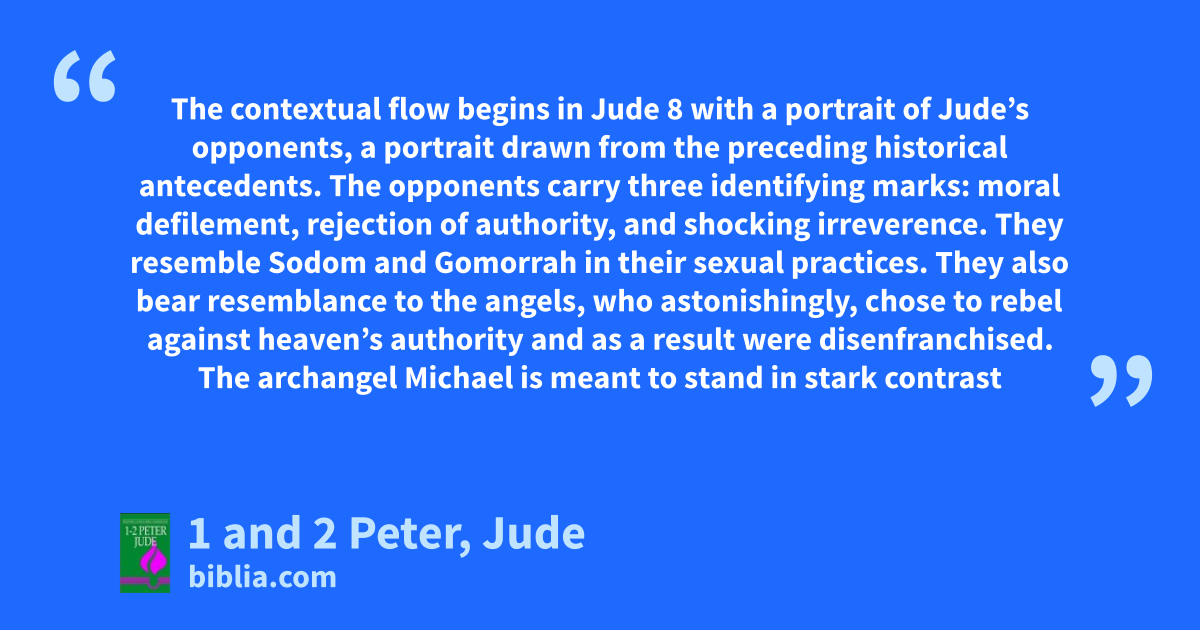 The contextual flow begins in Jude 8 with a portrait of Jude’s opponents, a portrait drawn from the preceding historical antecedents. The opponents carry three identifying marks: moral defilement, rejection of authority, and shocking irreverence. They resemble Sodom and Gomorrah in their sexual practices. They also bear resemblance to the angels, who astonishingly, chose to rebel against heaven’s authority and as a result were disenfranchised. The archangel Michael is meant to stand in stark contrast