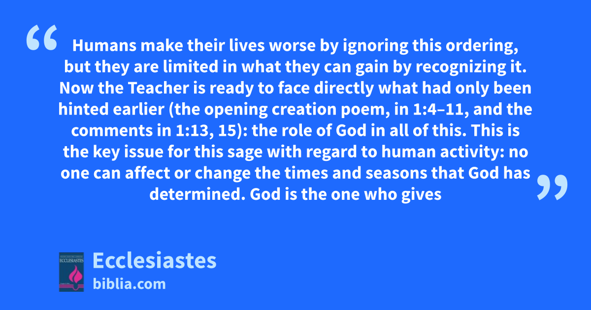 Humans make their lives worse by ignoring this ordering, but they are limited in what they can gain by recognizing it. Now the Teacher is ready to face directly what had only been hinted earlier (the opening creation poem, in 1:4–11, and the comments in 1:13, 15): the role of God in all of this. This is the key issue for this sage with regard to human activity: no one can affect or change the times and seasons that God has determined. God is the one who gives
