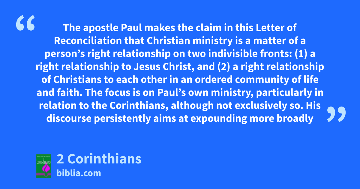 The apostle Paul makes the claim in this Letter of Reconciliation that Christian ministry is a matter of a person’s right relationship on two indivisible fronts: (1) a right relationship to Jesus Christ, and (2) a right relationship of Christians to each other in an ordered community of life and faith. The focus is on Paul’s own ministry, particularly in relation to the Corinthians, although not exclusively so. His discourse persistently aims at expounding more broadly