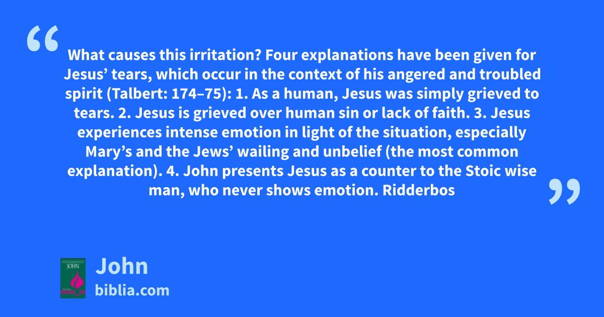 What causes this irritation? Four explanations have been given for Jesus’ tears, which occur in the context of his angered and troubled spirit (Talbert: 174–75): 1. As a human, Jesus was simply grieved to tears. 2. Jesus is grieved over human sin or lack of faith. 3. Jesus experiences intense emotion in light of the situation, especially Mary’s and the Jews’ wailing and unbelief (the most common explanation). 4. John presents Jesus as a counter to the Stoic wise man, who never shows emotion. Ridderbos