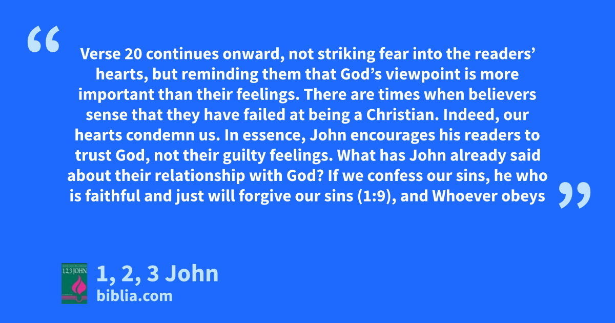 Verse 20 continues onward, not striking fear into the readers’ hearts, but reminding them that God’s viewpoint is more important than their feelings. There are times when believers sense that they have failed at being a Christian. Indeed, our hearts condemn us. In essence, John encourages his readers to trust God, not their guilty feelings. What has John already said about their relationship with God? If we confess our sins, he who is faithful and just will forgive our sins (1:9), and Whoever obeys