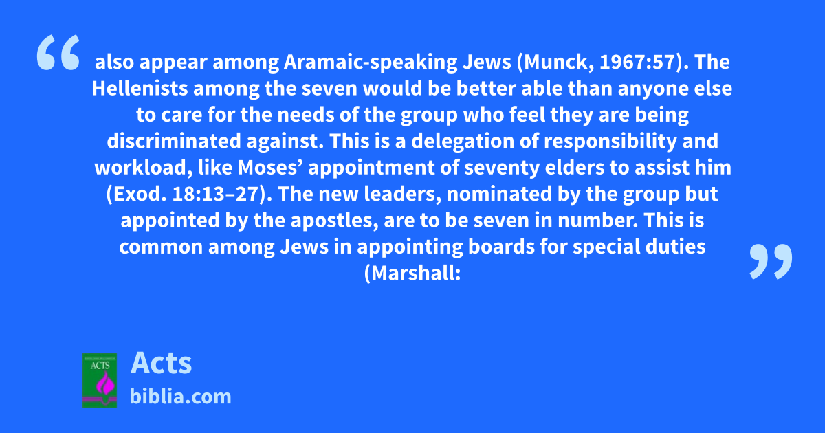 also appear among Aramaic-speaking Jews (Munck, 1967:57). The Hellenists among the seven would be better able than anyone else to care for the needs of the group who feel they are being discriminated against. This is a delegation of responsibility and workload, like Moses’ appointment of seventy elders to assist him (Exod. 18:13–27). The new leaders, nominated by the group but appointed by the apostles, are to be seven in number. This is common among Jews in appointing boards for special duties (Marshall: