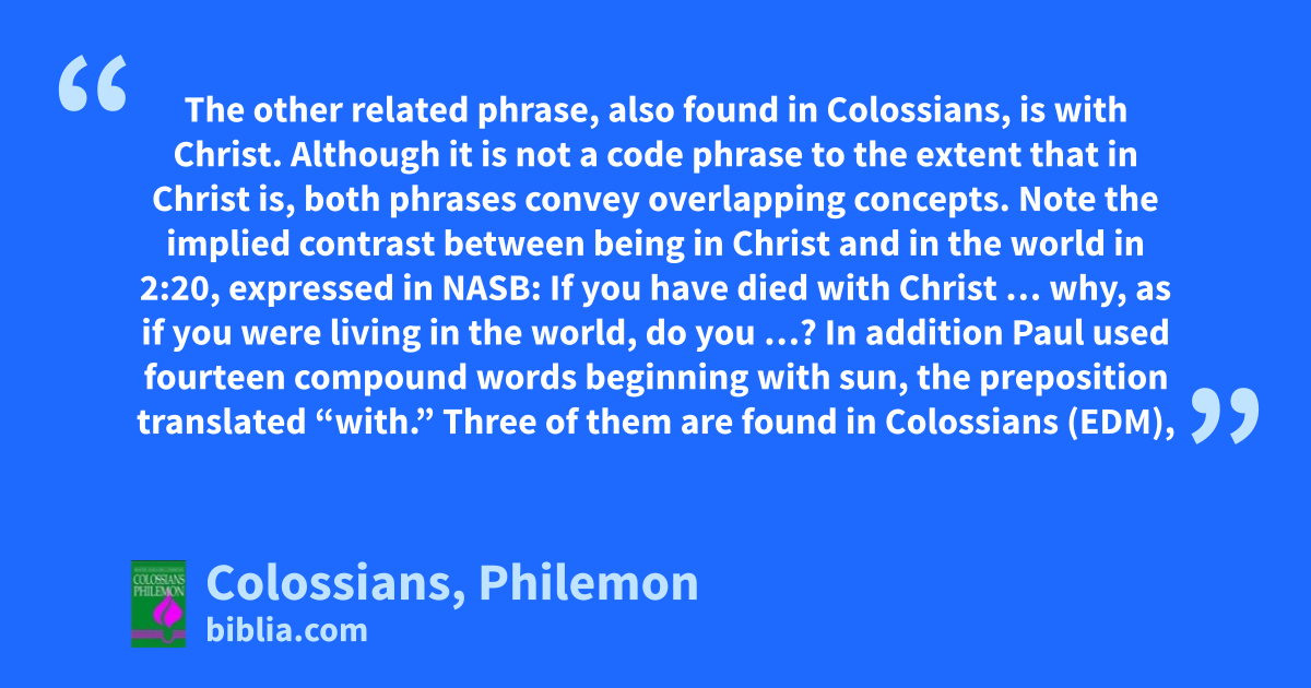 The other related phrase, also found in Colossians, is with Christ. Although it is not a code phrase to the extent that in Christ is, both phrases convey overlapping concepts. Note the implied contrast between being in Christ and in the world in 2:20, expressed in NASB: If you have died with Christ … why, as if you were living in the world, do you …? In addition Paul used fourteen compound words beginning with sun, the preposition translated “with.” Three of them are found in Colossians (EDM),