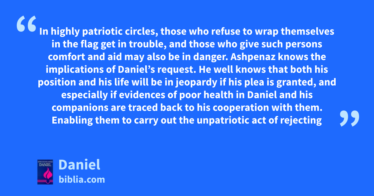 In highly patriotic circles, those who refuse to wrap themselves in the flag get in trouble, and those who give such persons comfort and aid may also be in danger. Ashpenaz knows the implications of Daniel’s request. He well knows that both his position and his life will be in jeopardy if his plea is granted, and especially if evidences of poor health in Daniel and his companions are traced back to his cooperation with them. Enabling them to carry out the unpatriotic act of rejecting