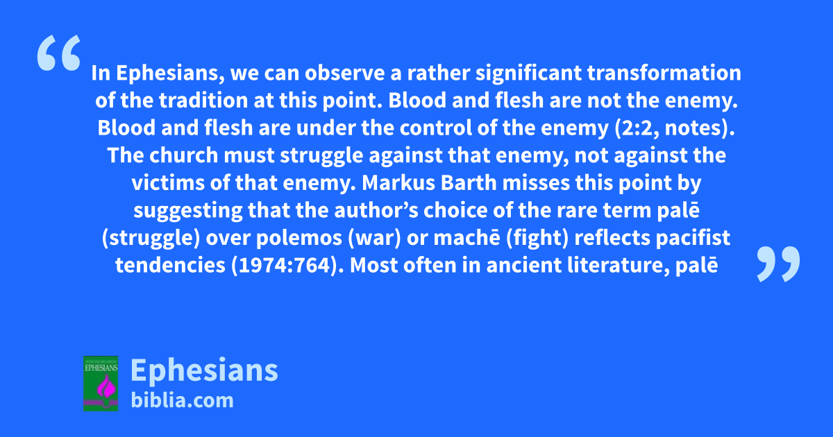 In Ephesians, we can observe a rather significant transformation of the tradition at this point. Blood and flesh are not the enemy. Blood and flesh are under the control of the enemy (2:2, notes). The church must struggle against that enemy, not against the victims of that enemy. Markus Barth misses this point by suggesting that the author’s choice of the rare term palē (struggle) over polemos (war) or machē (fight) reflects pacifist tendencies (1974:764). Most often in ancient literature, palē