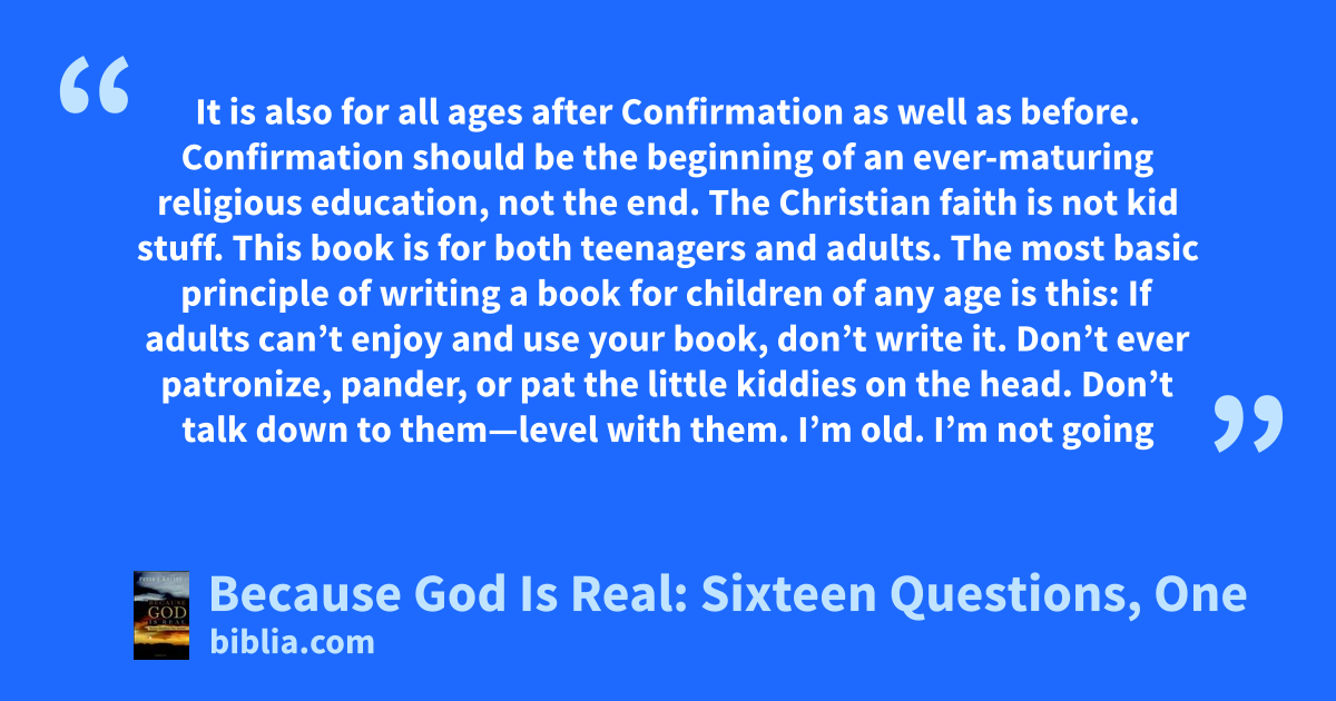 It is also for all ages after Confirmation as well as before. Confirmation should be the beginning of an ever-maturing religious education, not the end. The Christian faith is not kid stuff. This book is for both teenagers and adults. The most basic principle of writing a book for children of any age is this: If adults can’t enjoy and use your book, don’t write it. Don’t ever patronize, pander, or pat the little kiddies on the head. Don’t talk down to them—level with them. I’m old. I’m not going