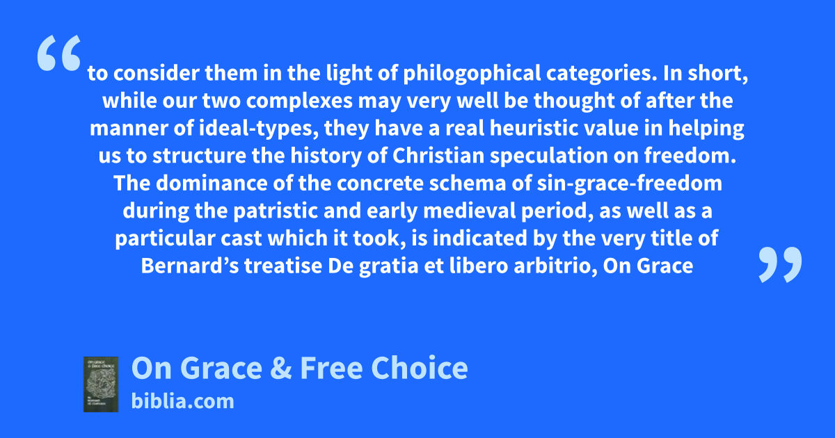 to consider them in the light of philogophical categories. In short, while our two complexes may very well be thought of after the manner of ideal-types, they have a real heuristic value in helping us to structure the history of Christian speculation on freedom. The dominance of the concrete schema of sin-grace-freedom during the patristic and early medieval period, as well as a particular cast which it took, is indicated by the very title of Bernard’s treatise De gratia et libero arbitrio, On Grace