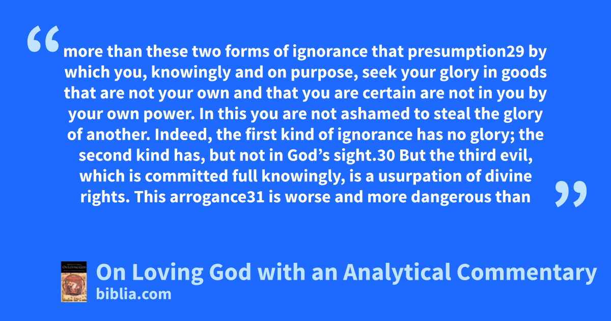 more than these two forms of ignorance that presumption29 by which you, knowingly and on purpose, seek your glory in goods that are not your own and that you are certain are not in you by your own power. In this you are not ashamed to steal the glory of another. Indeed, the first kind of ignorance has no glory; the second kind has, but not in God’s sight.30 But the third evil, which is committed full knowingly, is a usurpation of divine rights. This arrogance31 is worse and more dangerous than