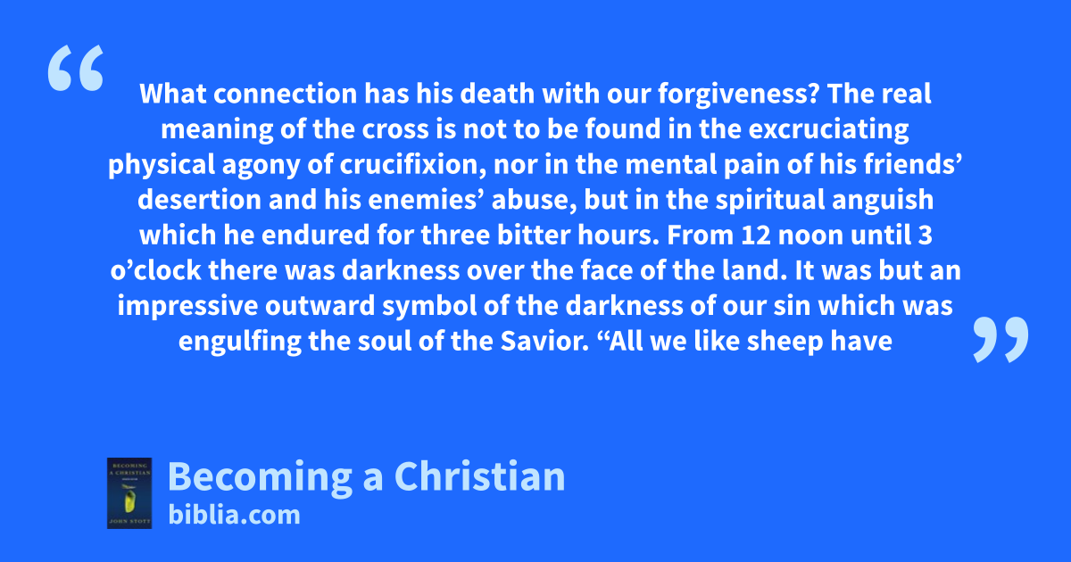 What connection has his death with our forgiveness? The real meaning of the cross is not to be found in the excruciating physical agony of crucifixion, nor in the mental pain of his friends’ desertion and his enemies’ abuse, but in the spiritual anguish which he endured for three bitter hours. From 12 noon until 3 o’clock there was darkness over the face of the land. It was but an impressive outward symbol of the darkness of our sin which was engulfing the soul of the Savior. “All we like sheep have