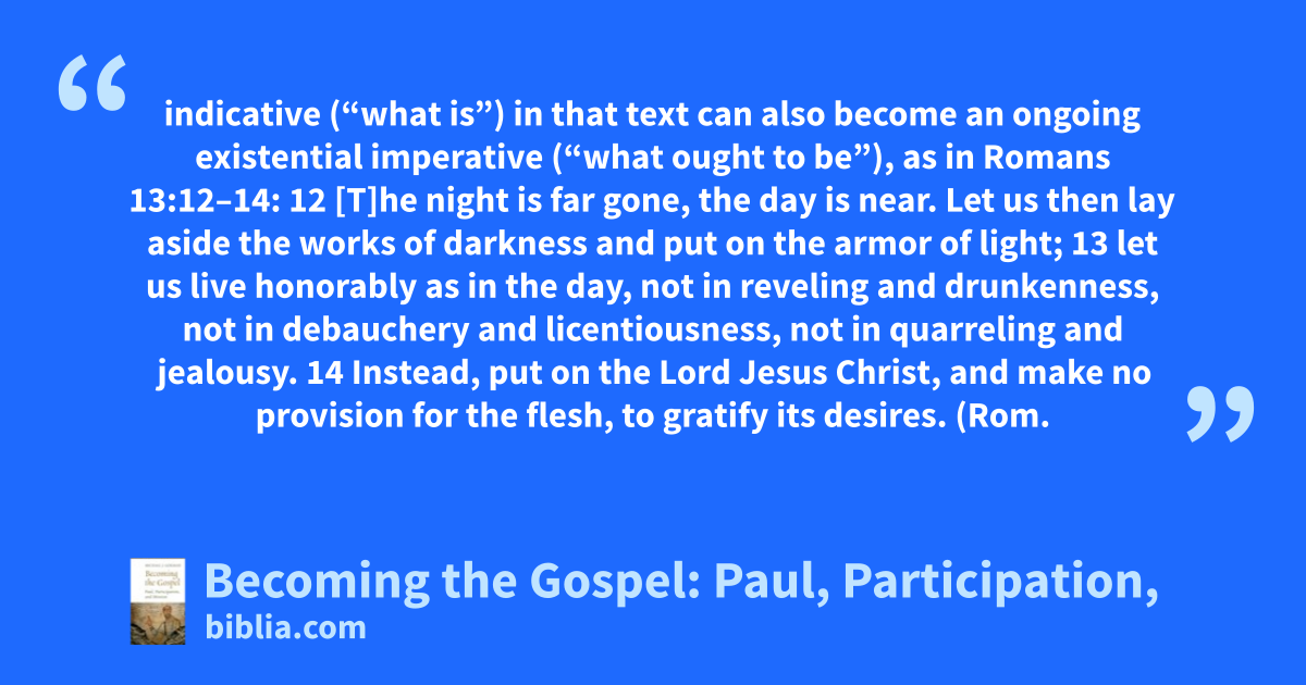 indicative (“what is”) in that text can also become an ongoing existential imperative (“what ought to be”), as in Romans 13:12–14: 12 [T]he night is far gone, the day is near. Let us then lay aside the works of darkness and put on the armor of light; 13 let us live honorably as in the day, not in reveling and drunkenness, not in debauchery and licentiousness, not in quarreling and jealousy. 14 Instead, put on the Lord Jesus Christ, and make no provision for the flesh, to gratify its desires. (Rom.
