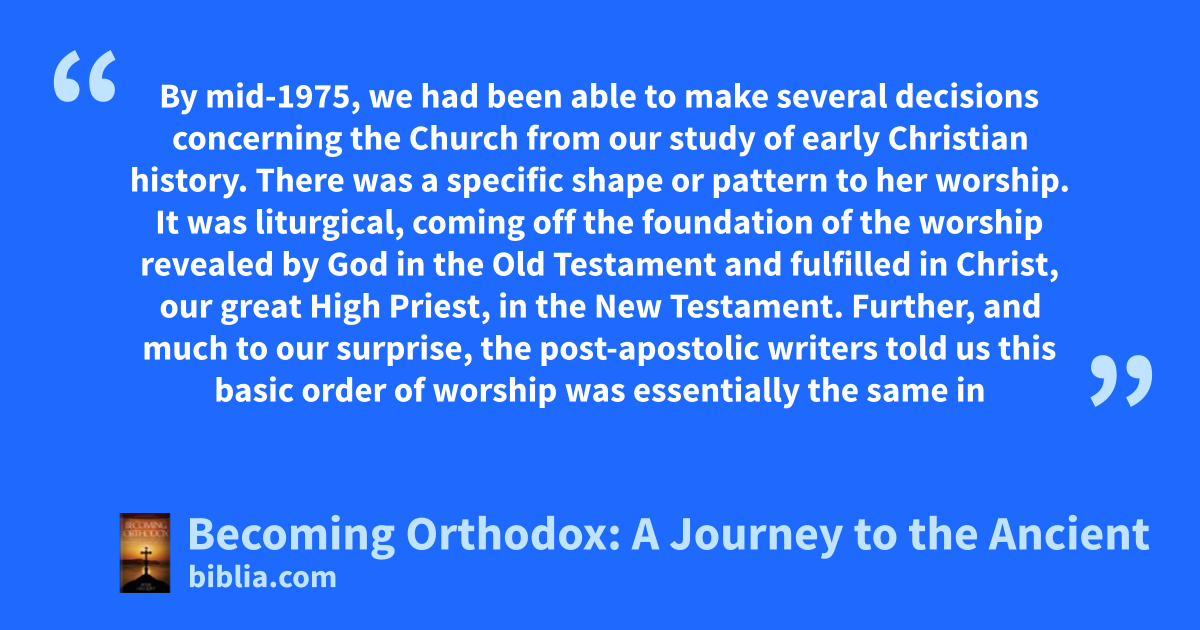 By mid-1975, we had been able to make several decisions concerning the Church from our study of early Christian history. There was a specific shape or pattern to her worship. It was liturgical, coming off the foundation of the worship revealed by God in the Old Testament and fulfilled in Christ, our great High Priest, in the New Testament. Further, and much to our surprise, the post-apostolic writers told us this basic order of worship was essentially the same in