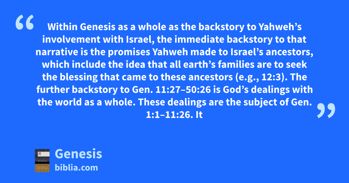 Within Genesis as a whole as the backstory to Yahweh’s involvement with Israel, the immediate backstory to that narrative is the promises Yahweh made to Israel’s ancestors, which include the idea that all earth’s families are to seek the blessing that came to these ancestors (e.g., 12:3). The further backstory to Gen. 11:27–50:26 is God’s dealings with the world as a whole. These dealings are the subject of Gen. 1:1–11:26. It