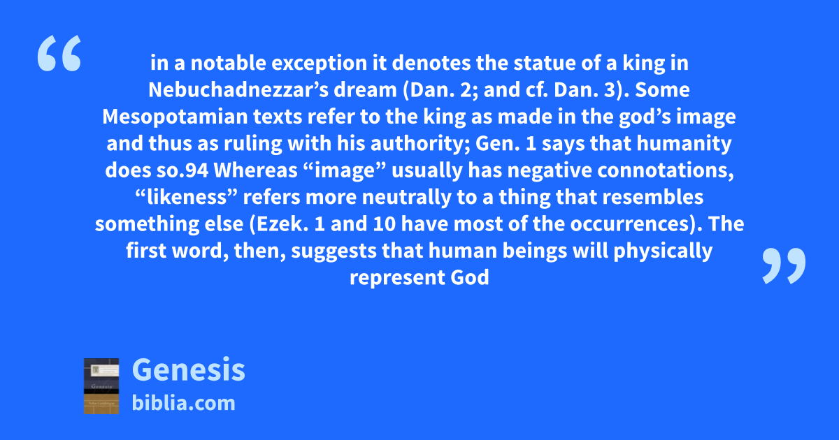 in a notable exception it denotes the statue of a king in Nebuchadnezzar’s dream (Dan. 2; and cf. Dan. 3). Some Mesopotamian texts refer to the king as made in the god’s image and thus as ruling with his authority; Gen. 1 says that humanity does so.94 Whereas “image” usually has negative connotations, “likeness” refers more neutrally to a thing that resembles something else (Ezek. 1 and 10 have most of the occurrences). The first word, then, suggests that human beings will physically represent God