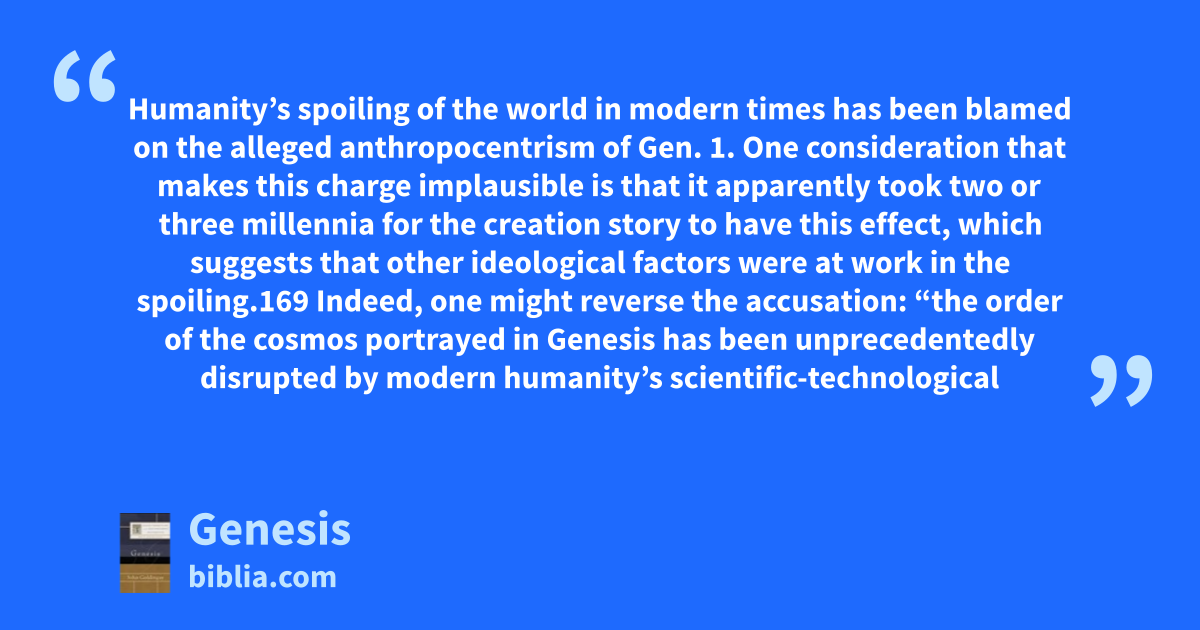 Humanity’s spoiling of the world in modern times has been blamed on the alleged anthropocentrism of Gen. 1. One consideration that makes this charge implausible is that it apparently took two or three millennia for the creation story to have this effect, which suggests that other ideological factors were at work in the spoiling.169 Indeed, one might reverse the accusation: “the order of the cosmos portrayed in Genesis has been unprecedentedly disrupted by modern humanity’s scientific-technological