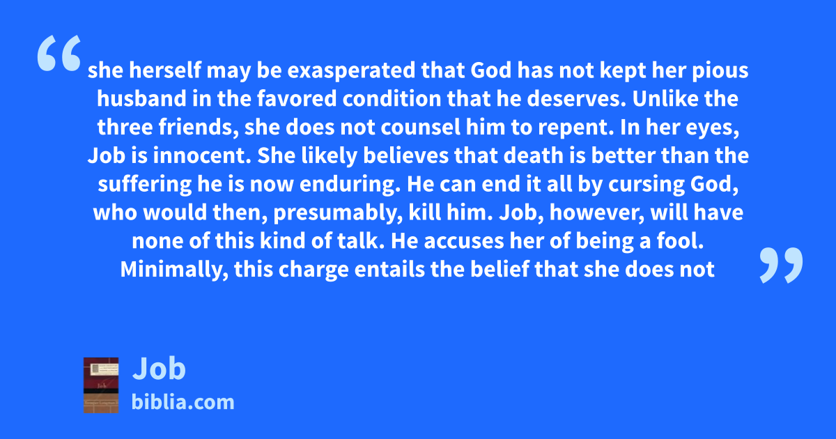 she herself may be exasperated that God has not kept her pious husband in the favored condition that he deserves. Unlike the three friends, she does not counsel him to repent. In her eyes, Job is innocent. She likely believes that death is better than the suffering he is now enduring. He can end it all by cursing God, who would then, presumably, kill him. Job, however, will have none of this kind of talk. He accuses her of being a fool. Minimally, this charge entails the belief that she does not