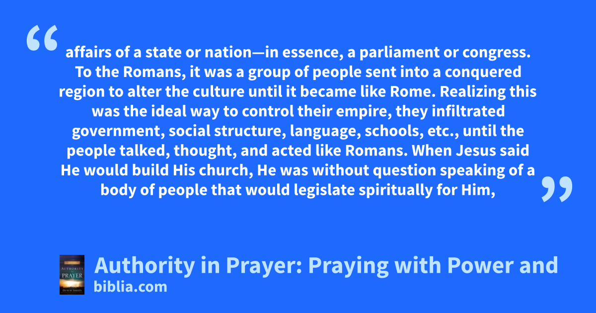 affairs of a state or nation—in essence, a parliament or congress. To the Romans, it was a group of people sent into a conquered region to alter the culture until it became like Rome. Realizing this was the ideal way to control their empire, they infiltrated government, social structure, language, schools, etc., until the people talked, thought, and acted like Romans. When Jesus said He would build His church, He was without question speaking of a body of people that would legislate spiritually for Him,