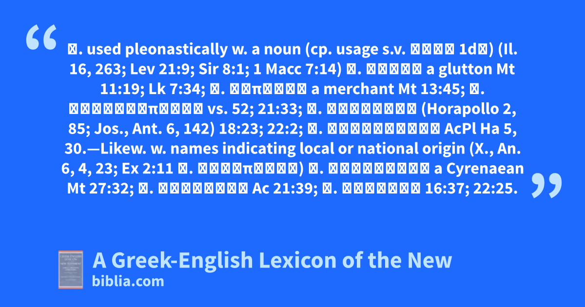ε. used pleonastically w. a noun (cp. usage s.v. ἀνήρ 1dα) (Il. 16, 263; Lev 21:9; Sir 8:1; 1 Macc 7:14) ἄ. φάγος a glutton Mt 11:19; Lk 7:34; ἄ. ἔμπορος a merchant Mt 13:45; ἄ. οἰκοδεσπότης vs. 52; 21:33; ἄ. βασιλεύς (Horapollo 2, 85; Jos., Ant. 6, 142) 18:23; 22:2; ἄ. θηριομάχος AcPl Ha 5, 30.—Likew. w. names indicating local or national origin (X., An. 6, 4, 23; Ex 2:11 ἄ. Αἰγύπτιος) ἄ. Κυρηναῖος a Cyrenaean Mt 27:32; ἄ. Ἰουδαῖος Ac 21:39; ἄ. Ῥωμαῖος 16:37; 22:25.