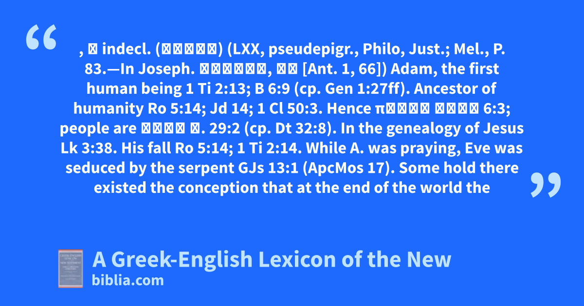 , ὁ indecl. (אָדָם) (LXX, pseudepigr., Philo, Just.; Mel., P. 83.—In Joseph. Ἄδαμος, ου [Ant. 1, 66]) Adam, the first human being 1 Ti 2:13; B 6:9 (cp. Gen 1:27ff). Ancestor of humanity Ro 5:14; Jd 14; 1 Cl 50:3. Hence πατὴρ ἡμῶν 6:3; people are υἱοὶ Ἀ. 29:2 (cp. Dt 32:8). In the genealogy of Jesus Lk 3:38. His fall Ro 5:14; 1 Ti 2:14. While A. was praying, Eve was seduced by the serpent GJs 13:1 (ApcMos 17). Some hold there existed the conception that at the end of the world the