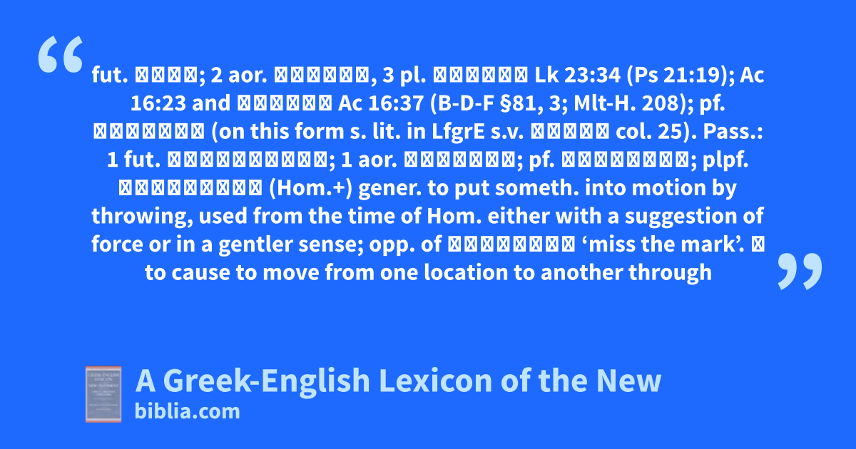 fut. βαλῶ; 2 aor. ἔβαλον, 3 pl. ἔβαλον Lk 23:34 (Ps 21:19); Ac 16:23 and ἔβαλαν Ac 16:37 (B-D-F §81, 3; Mlt-H. 208); pf. βέβληκα (on this form s. lit. in LfgrE s.v. βάλλω col. 25). Pass.: 1 fut. βληθήσομαι; 1 aor. ἐβλήθην; pf. βέβλημαι; plpf. ἐβεβλήμην (Hom.+) gener. to put someth. into motion by throwing, used from the time of Hom. either with a suggestion of force or in a gentler sense; opp. of ἁμαρτάνω ‘miss the mark’. ① to cause to move from one location to another through
