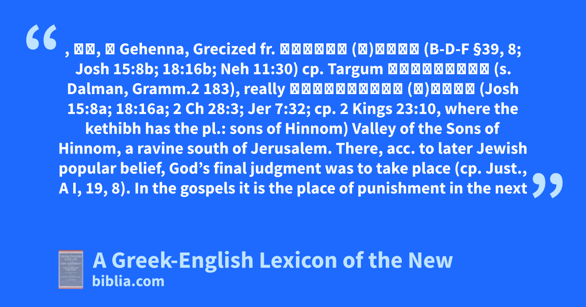 , ης, ἡ Gehenna, Grecized fr. הִנֹּם (א)גֵּי (B-D-F §39, 8; Josh 15:8b; 18:16b; Neh 11:30) cp. Targum גֵיהִנָּם (s. Dalman, Gramm.2 183), really בֶן־הִנֹּם (א)גֵּי (Josh 15:8a; 18:16a; 2 Ch 28:3; Jer 7:32; cp. 2 Kings 23:10, where the kethibh has the pl.: sons of Hinnom) Valley of the Sons of Hinnom, a ravine south of Jerusalem. There, acc. to later Jewish popular belief, God’s final judgment was to take place (cp. Just., A I, 19, 8). In the gospels it is the place of punishment in the next