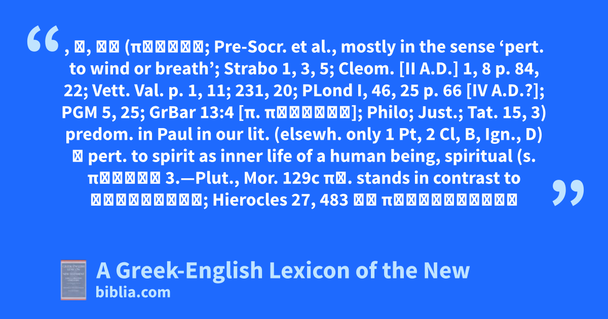 , ή, όν (πνεῦμα; Pre-Socr. et al., mostly in the sense ‘pert. to wind or breath’; Strabo 1, 3, 5; Cleom. [II A.D.] 1, 8 p. 84, 22; Vett. Val. p. 1, 11; 231, 20; PLond I, 46, 25 p. 66 [IV A.D.?]; PGM 5, 25; GrBar 13:4 [π. πατέρας]; Philo; Just.; Tat. 15, 3) predom. in Paul in our lit. (elsewh. only 1 Pt, 2 Cl, B, Ign., D) ① pert. to spirit as inner life of a human being, spiritual (s. πνεῦμα 3.—Plut., Mor. 129c πν. stands in contrast to σωματικόν; Hierocles 27, 483 τὸ πνευματικὸν