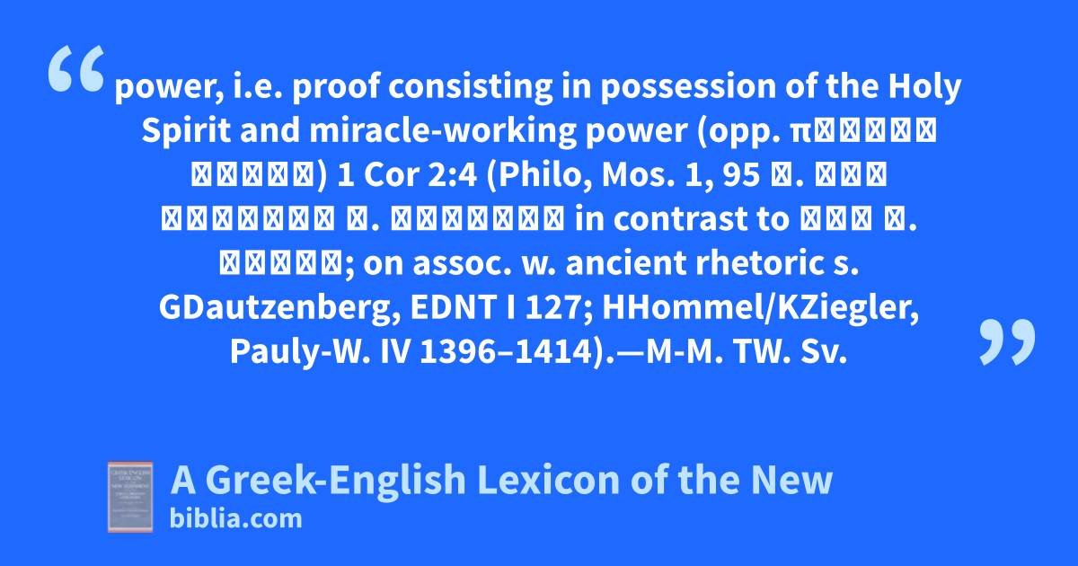 power, i.e. proof consisting in possession of the Holy Spirit and miracle-working power (opp. πειθοὶ λόγοι) 1 Cor 2:4 (Philo, Mos. 1, 95 ἀ. διὰ σημείων κ. τεράτων in contrast to διὰ τ. λόγων; on assoc. w. ancient rhetoric s. GDautzenberg, EDNT I 127; HHommel/KZiegler, Pauly-W. IV 1396–1414).—M-M. TW. Sv.