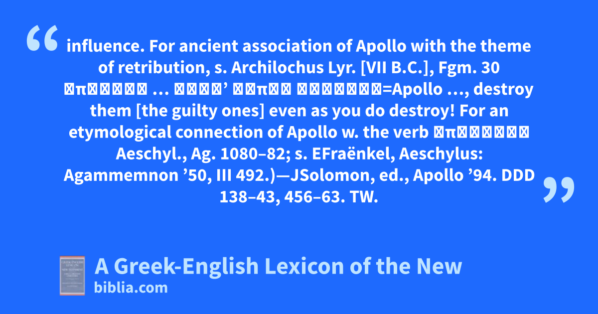 influence. For ancient association of Apollo with the theme of retribution, s. Archilochus Lyr. [VII B.C.], Fgm. 30 Ἄπολλον … ὄλλυʼ ὥσπερ ὀλλύεις=Apollo …, destroy them [the guilty ones] even as you do destroy! For an etymological connection of Apollo w. the verb ἀπόλλυμι Aeschyl., Ag. 1080–82; s. EFraënkel, Aeschylus: Agammemnon ’50, III 492.)—JSolomon, ed., Apollo ’94. DDD 138–43, 456–63. TW.