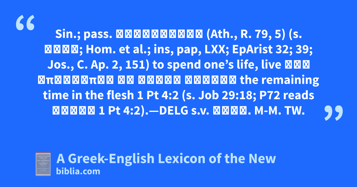 Sin.; pass. βεβιωμένων (Ath., R. 79, 5) (s. βίος; Hom. et al.; ins, pap, LXX; EpArist 32; 39; Jos., C. Ap. 2, 151) to spend one’s life, live τόν ἐπίλοιπον ἐν σαρκὶ χρόνον the remaining time in the flesh 1 Pt 4:2 (s. Job 29:18; P72 reads σῶσαι 1 Pt 4:2).—DELG s.v. βίος. M-M. TW.