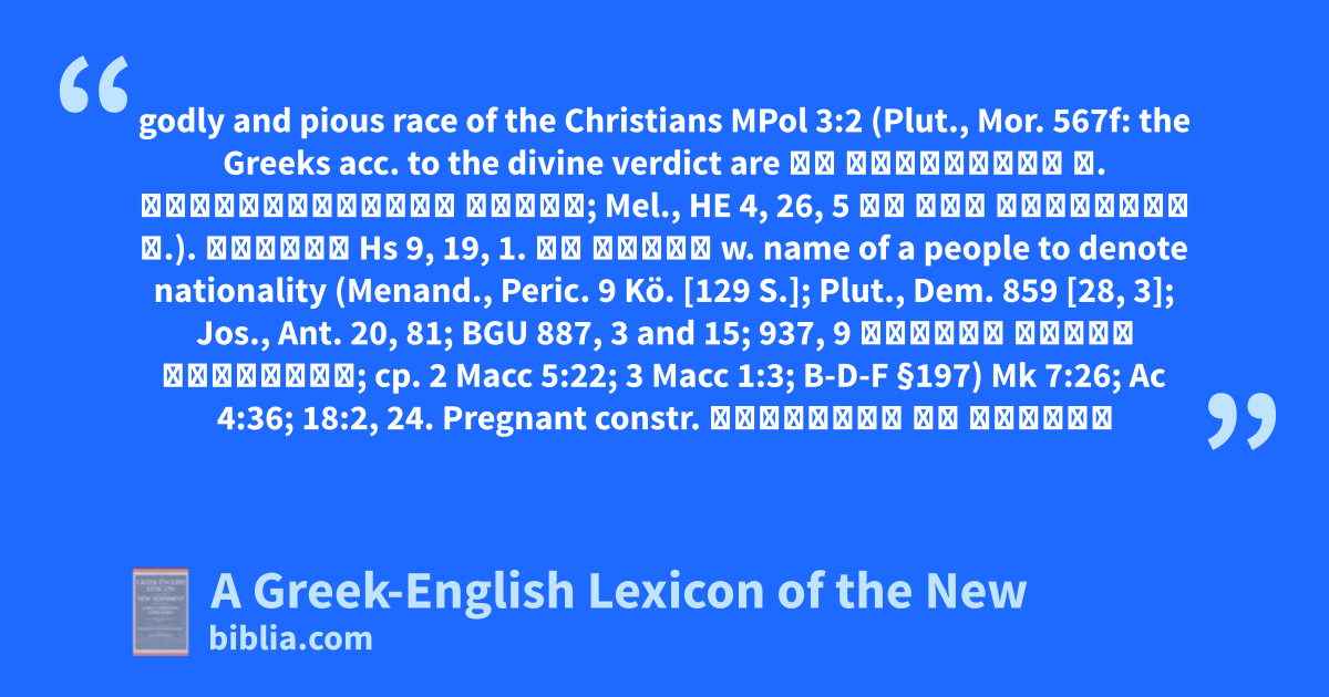 godly and pious race of the Christians MPol 3:2 (Plut., Mor. 567f: the Greeks acc. to the divine verdict are τὸ βέλτιστον κ. θεοφιλέστατον γένος; Mel., HE 4, 26, 5 τὸ τῶν θεοσεβῶν γ.). ἄνομον Hs 9, 19, 1. τῷ γένει w. name of a people to denote nationality (Menand., Peric. 9 Kö. [129 S.]; Plut., Dem. 859 [28, 3]; Jos., Ant. 20, 81; BGU 887, 3 and 15; 937, 9 δοῦλος γένει Ποντικός; cp. 2 Macc 5:22; 3 Macc 1:3; B-D-F §197) Mk 7:26; Ac 4:36; 18:2, 24. Pregnant constr. κίνδυνοι ἐκ γένους