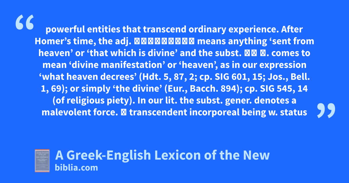powerful entities that transcend ordinary experience. After Homer’s time, the adj. δαιμόνιος means anything ‘sent from heaven’ or ‘that which is divine’ and the subst. τὸ δ. comes to mean ‘divine manifestation’ or ‘heaven’, as in our expression ‘what heaven decrees’ (Hdt. 5, 87, 2; cp. SIG 601, 15; Jos., Bell. 1, 69); or simply ‘the divine’ (Eur., Bacch. 894); cp. SIG 545, 14 (of religious piety). In our lit. the subst. gener. denotes a malevolent force. ① transcendent incorporeal being w. status