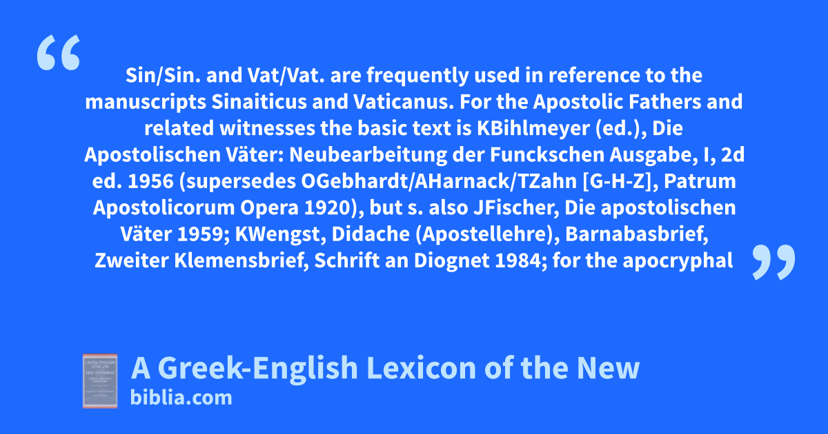 Sin/Sin. and Vat/Vat. are frequently used in reference to the manuscripts Sinaiticus and Vaticanus. For the Apostolic Fathers and related witnesses the basic text is KBihlmeyer (ed.), Die Apostolischen Väter: Neubearbeitung der Funckschen Ausgabe, I, 2d ed. 1956 (supersedes OGebhardt/AHarnack/TZahn [G-H-Z], Patrum Apostolicorum Opera 1920), but s. also JFischer, Die apostolischen Väter 1959; KWengst, Didache (Apostellehre), Barnabasbrief, Zweiter Klemensbrief, Schrift an Diognet 1984; for the apocryphal