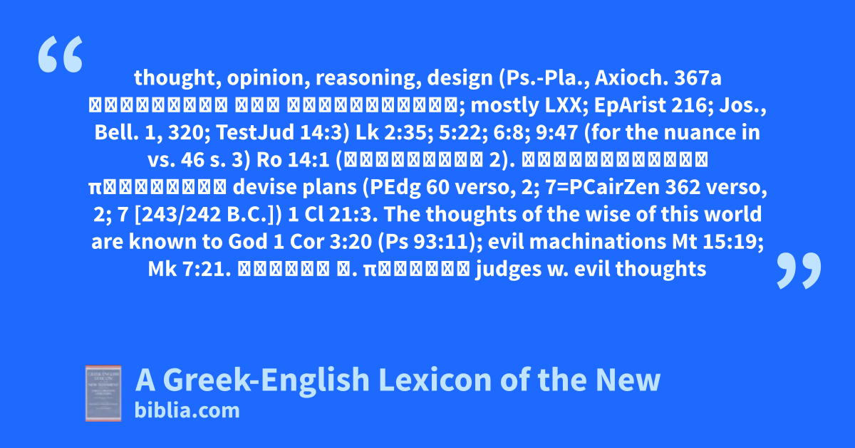 thought, opinion, reasoning, design (Ps.-Pla., Axioch. 367a φροντίδες καὶ διαλογισμοί; mostly LXX; EpArist 216; Jos., Bell. 1, 320; TestJud 14:3) Lk 2:35; 5:22; 6:8; 9:47 (for the nuance in vs. 46 s. 3) Ro 14:1 (διάκρισις 2). διαλογισμοὺς ποιεῖσθαι devise plans (PEdg 60 verso, 2; 7=PCairZen 362 verso, 2; 7 [243/242 B.C.]) 1 Cl 21:3. The thoughts of the wise of this world are known to God 1 Cor 3:20 (Ps 93:11); evil machinations Mt 15:19; Mk 7:21. κριταὶ δ. πονηρῶν judges w. evil thoughts