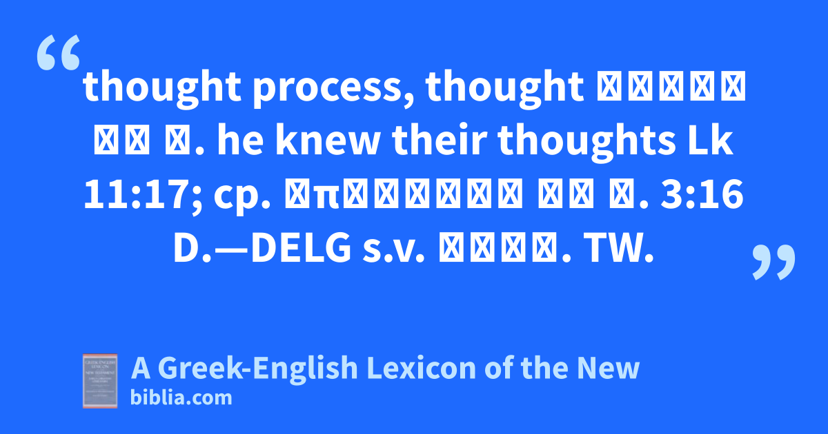 thought process, thought εἰδὼς τὰ δ. he knew their thoughts Lk 11:17; cp. ἐπιγνοὺς τὰ δ. 3:16 D.—DELG s.v. νόος. TW.