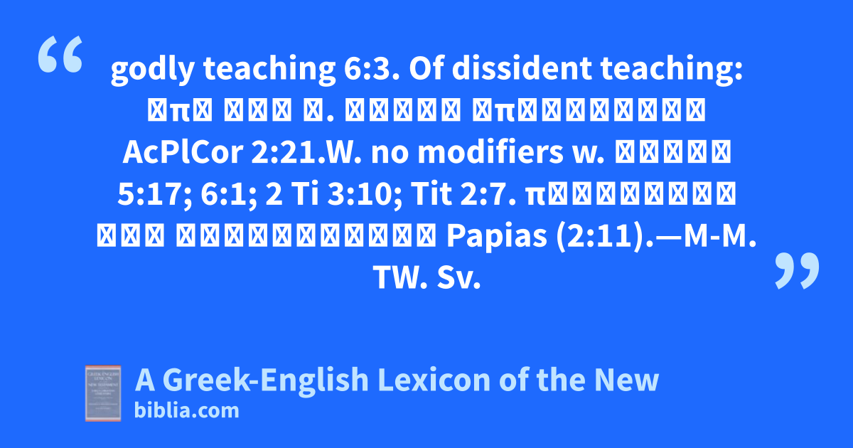 godly teaching 6:3. Of dissident teaching: ἀπὸ τῆς δ. αὐτῶν ἀποφεύγετε AcPlCor 2:21.W. no modifiers w. λόγος 5:17; 6:1; 2 Ti 3:10; Tit 2:7. παραβολὰς και διδασκαλίας Papias (2:11).—M-M. TW. Sv.