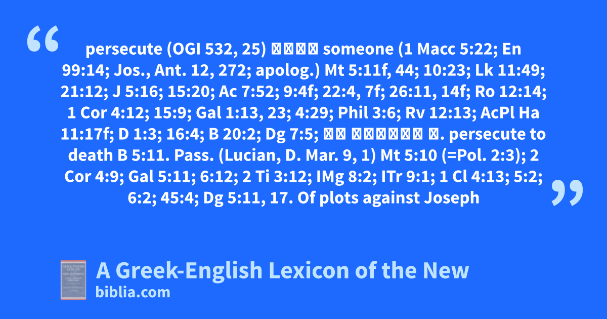 persecute (OGI 532, 25) τινά someone (1 Macc 5:22; En 99:14; Jos., Ant. 12, 272; apolog.) Mt 5:11f, 44; 10:23; Lk 11:49; 21:12; J 5:16; 15:20; Ac 7:52; 9:4f; 22:4, 7f; 26:11, 14f; Ro 12:14; 1 Cor 4:12; 15:9; Gal 1:13, 23; 4:29; Phil 3:6; Rv 12:13; AcPl Ha 11:17f; D 1:3; 16:4; B 20:2; Dg 7:5; ἐν θανάτῳ δ. persecute to death B 5:11. Pass. (Lucian, D. Mar. 9, 1) Mt 5:10 (=Pol. 2:3); 2 Cor 4:9; Gal 5:11; 6:12; 2 Ti 3:12; IMg 8:2; ITr 9:1; 1 Cl 4:13; 5:2; 6:2; 45:4; Dg 5:11, 17. Of plots against Joseph