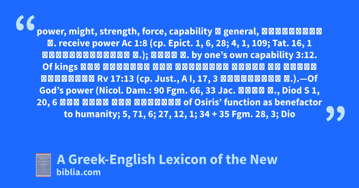 power, might, strength, force, capability ⓐ general, λαμβάνειν δ. receive power Ac 1:8 (cp. Epict. 1, 6, 28; 4, 1, 109; Tat. 16, 1 δραστικωτέρας δ.); ἰδίᾳ δ. by one’s own capability 3:12. Of kings τὴν δύναμιν καὶ ἐξουσίαν αὐτῶν τῷ θηρίῳ διδόασιν Rv 17:13 (cp. Just., A I, 17, 3 βασιλικῆς δ.).—Of God’s power (Nicol. Dam.: 90 Fgm. 66, 33 Jac. θεῶν δ., Diod S 1, 20, 6 τοῦ θεοῦ τὴν δύναμιν of Osiris’ function as benefactor to humanity; 5, 71, 6; 27, 12, 1; 34 + 35 Fgm. 28, 3; Dio