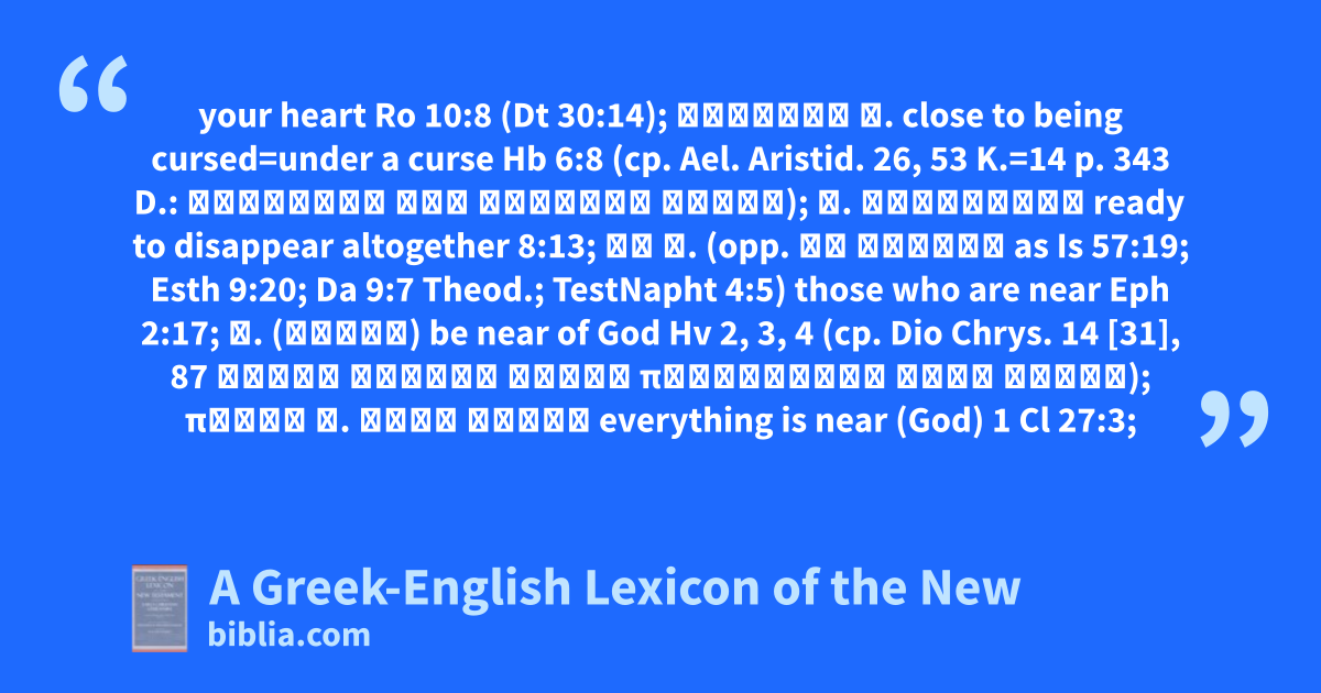 your heart Ro 10:8 (Dt 30:14); κατάρας ἐ. close to being cursed=under a curse Hb 6:8 (cp. Ael. Aristid. 26, 53 K.=14 p. 343 D.: ἀμήχανον καὶ κατάρας ἐγγύς); ἐ. ἀφανισμοῦ ready to disappear altogether 8:13; οἱ ἐ. (opp. οἱ μακράν as Is 57:19; Esth 9:20; Da 9:7 Theod.; TestNapht 4:5) those who are near Eph 2:17; ἐ. (εἶναι) be near of God Hv 2, 3, 4 (cp. Dio Chrys. 14 [31], 87 τινὲς σφόδρα ἐγγὺς παρεστῶτες τοῖς θεοῖς); πάντα ἐ. αὐτῷ ἐστιν everything is near (God) 1 Cl 27:3;