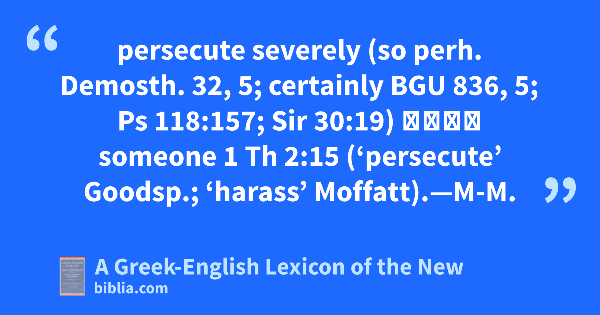persecute severely (so perh. Demosth. 32, 5; certainly BGU 836, 5; Ps 118:157; Sir 30:19) τινά someone 1 Th 2:15 (‘persecute’ Goodsp.; ‘harass’ Moffatt).—M-M.