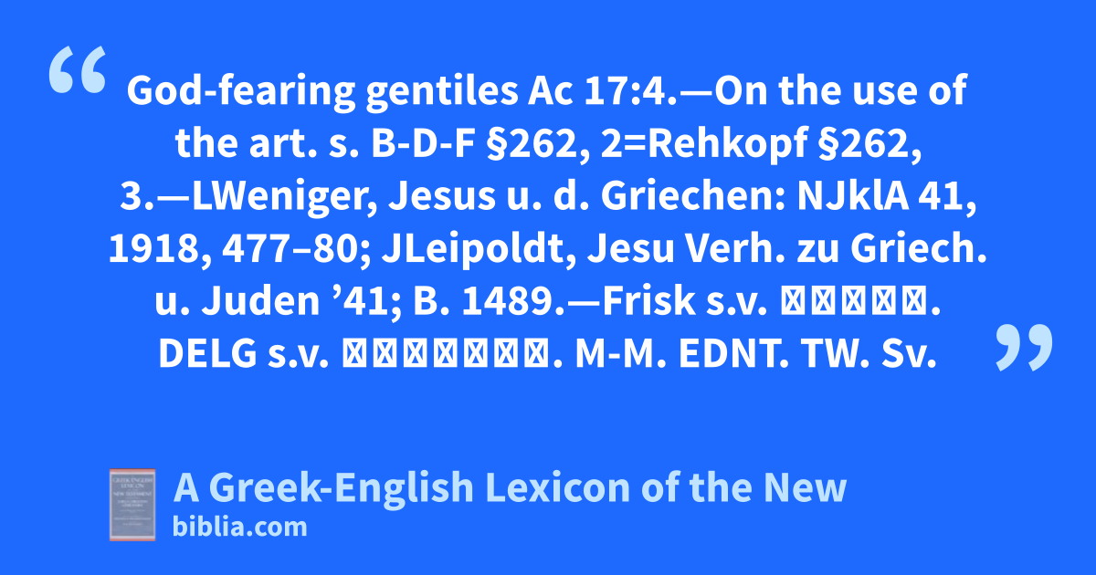 God-fearing gentiles Ac 17:4.—On the use of the art. s. B-D-F §262, 2=Rehkopf §262, 3.—LWeniger, Jesus u. d. Griechen: NJklA 41, 1918, 477–80; JLeipoldt, Jesu Verh. zu Griech. u. Juden ’41; B. 1489.—Frisk s.v. Ἑλλάς. DELG s.v. Ἕλληνες. M-M. EDNT. TW. Sv.